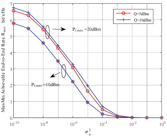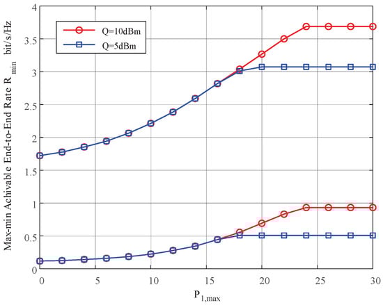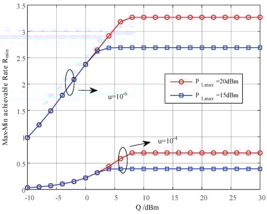 Figure 3 depicts the the max–min achievable rate versus the peak power of source when (3, 7) m, (5, 10) dBm, 15 dBm and . The result shows that increases and tends to saturate to a stable value as increases to a certain value. This is because is proportional to the user’s transmission power, and the cognitive user transmission power is affected by Q and at the same time. When is small, the user’s transmit power is limited by . Thus, increases as . As increases to a certain value (larger than Q), however, the user’s transmit power is limited by Q. Thus, continuing to increase will not change .