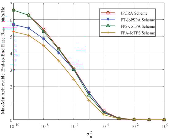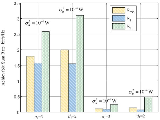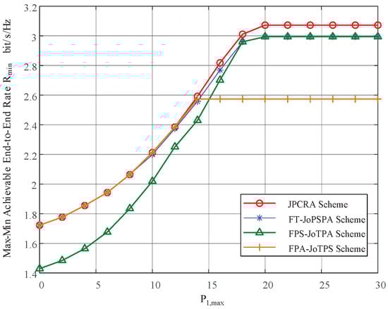 Figure 5 compares the max–min achievable rate () obtained by the proposed JPCRA scheme with the end-to-end rate (we use to denote the transmission rate of source () obtained by the maximization of achievable sum-rate (MASR) scheme []. In the simulation, parameters are set as {2, 3} m, {2, 3} m, (15, 15) dBm and W. This figure clearly shows that increases as decreases while remains the same, and also increases, because the system with MASR scheme will enhance the transmission ability of the high channel quality to maximize the achievable sum-rate. Thus, the MASR scheme cannot enhance the transmission ability of the poor channel, which may mean that the transmission links with a poor channel quality do not meet their transmission needs. The proposed scheme considers the transmission fairness, effectively alleviating the effects caused by channel asymmetry. Therefore, when the system values the enhancement of the worst performance of a user most in this system, it is better to choose the proposed JPCRA scheme, whereas when the system values the enhancement of the system achievable sum rate most, it is better to choose the MASR scheme.