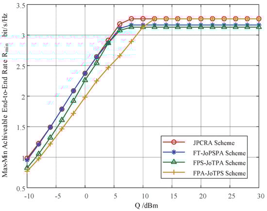 Figure 6 depicts the max–min achievable rate of the proposed JPCRA scheme versus the interference threshold of the primary network, which is compared with three traditional transmission schemes. The parameters are set as (3, 7) m, = 20 dBm, 15 dBm, W. It is observed that as the interference threshold increases, the of each scheme increases and saturates at a stable value. This is because the transmit power of the cognitive user is mainly constrained by power control when the interference threshold is small; as the interference threshold increases to a certain value, the transmit power of the cognitive user is mainly constrained by the peak power limits. In this figure, the peak power is a fixed parameter; thus, the performance saturates as the interference threshold increases to a certain value. The proposed JPCRA scheme outperforms the other three schemes in the whole range of Q. When the interference threshold is a high SNR value, it is possible to use the FPA-JoTPS scheme to replace JPCRA, and when the interference threshold is a low SNR value, it is possible to use the FT-JoPSPA scheme to replace JPCRA.