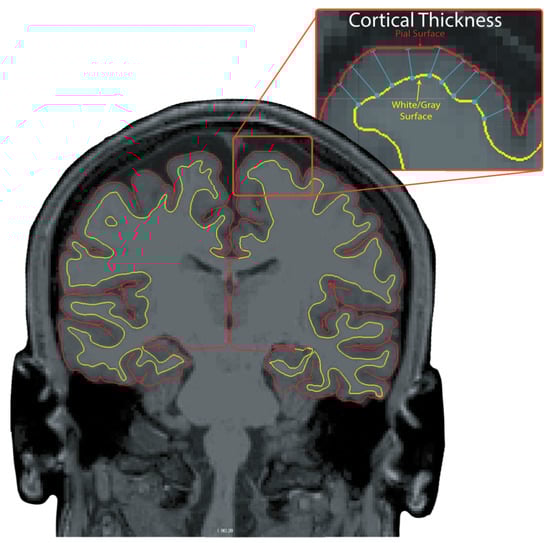 - Fischl, B.; Dale, A.M. Measuring the thickness of the human cerebral cortex from magnetic resonance images. Proc. Natl. Acad. Sci. USA 2000, 97, 11050–11055. [Google Scholar] [CrossRef]
