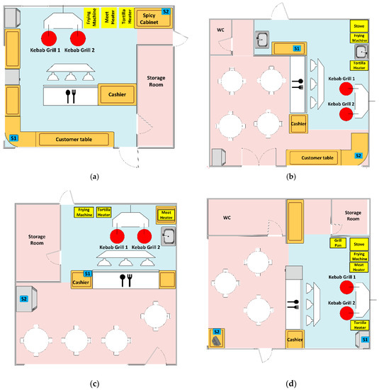 Figure 1. In each facility, the kitchen zone and the restaurant zone could be distinguished. The division of space is conventional since the zones have different functions. There are no physical barriers between them in the form of walls or other dividers. The zones are equipped differently. Different activities take place there, which are realized by different people. In the kitchen zone, meals are prepared. Here, there are grills, a stove, a sink, a refrigerator, and tabletops for cutting ingredients as well as composing and serving dishes. It is accessible only to staff. The dining area is where the consumption of meals takes place. Tables or tabletops are located here. The zone is accessible to the restaurant’s guests and staff. During the restaurant’s operating hours, different conditions are expected in each of the zones that are suitable for the people who are there and the tasks these people perform.