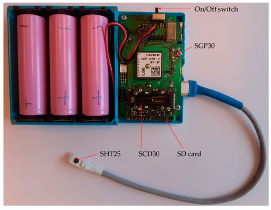 Figure 2. It is small (12 × 8 × 2.5 cm), self-contained, and automatic. It collects the measurement data with a temporal resolution of 2 s. The data were saved on an SD card. Batteries assure continuous, unattended operation of the device for at least five days.