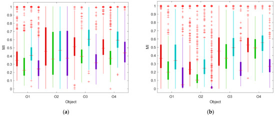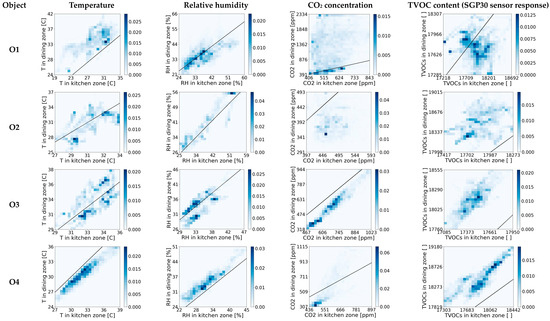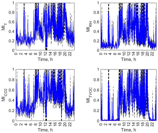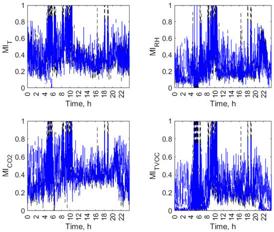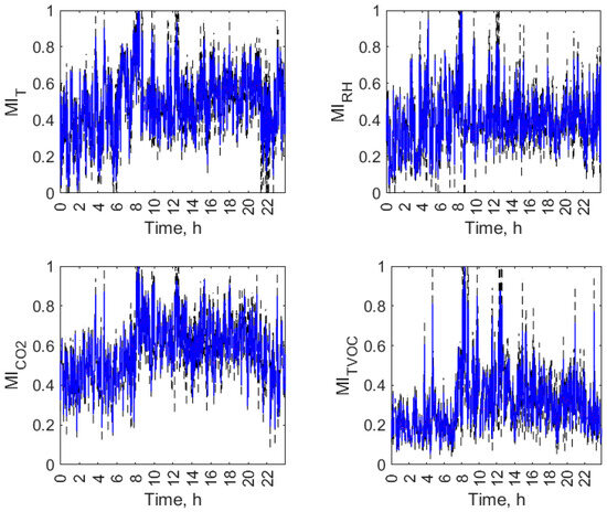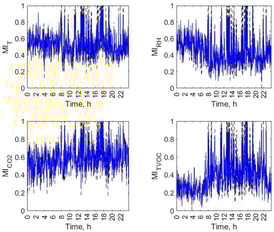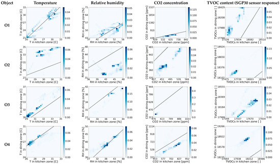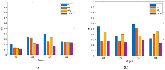 While , and are simply nonnegative, belongs to the range between zero and one. allows for convenient comparison of the degree of co-dependence between indoor conditions in the kitchen and the dining zones regarding various air parameters and in various objects. Further in this work, when using the abbreviation MI, we are referring to scaled mutual information MIv as defined by Equation (8) without pointing at the particular air parameter.