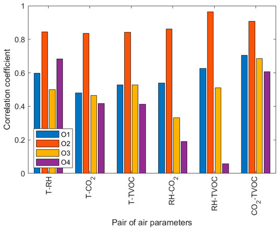 The degree of interdependence was parameter-dependent. The weakest mutual dependence between zones was found for the TVOC (short-term and long-term). The strongest co-dependence existed for the CO2 (short-term) and T (long-term).