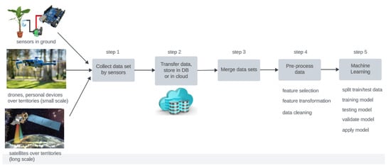 The data sources might be, at the large scale, satellites that collect images of the territories; at a lower scale, drones or personal devices such as mobile phones or tablets; and at the small scale, specific sensors installed in the territory monitoring physical quantities or chemicals. The collected data (step 1) are transferred by means of the data transfer protocols to be stored in files or databases on remote servers (step 2). The obtained datasets could be shared, published, and reused so that the effort and costs for the collection of data are cut and amortized. If this happens, the previous two steps do not need to be executed at any time, and the pipeline starts from the following steps. Data merge (step 3) is needed for a complete and profitable data analysis and ML model training, in which sensor data are fused, and consolidated at the same level of (spatial and temporal) granularity, and datasets are integrated. The following steps encompass the proper data analysis activities. In step 4, there are possible data transformation phases, that could prepare new features from the original ones, clean data for the missing or noisy values, discard the subsets of features that are of little use, etc. Some ML methods, such as deep neural networks, support vector machines, principal component analysis, singular vector decomposition, ensemble methods, and decision trees include some operations of feature selection or transformation. In these cases, the pipeline could omit step 4 and proceed to the following step 5, specifically focused on the activities of ML: model training, testing, validation, and application with the final goal of obtaining a digital model of a physical phenomenon or of an interesting target variable, whose estimation is based and reconstructed based on observed and measured physical quantities.