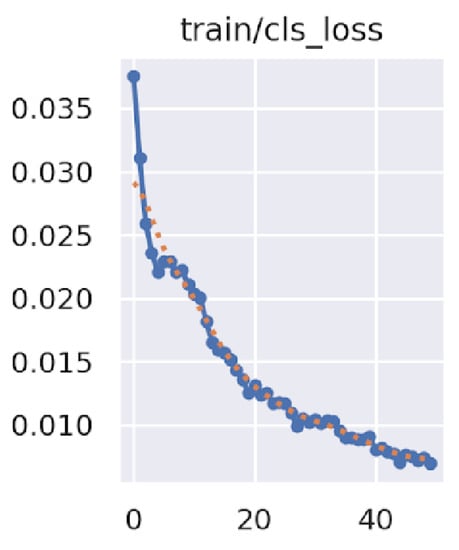 The model was trained on the training set for 50 epochs using a batch size of 16 images. The model was trained using Google Colab, exploiting its NVIDIA A100-SXM4 40 GB GPU, completing 50 epochs in 47 min; (the script for training YOLO5m model is publicly available at https://github.com/gabrielesartor/cocoa-pods-diseases-detection (accessed on 19 May 2023)). Figure 2 shows the loss reduction on the training set with the number of epochs.