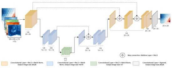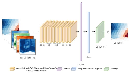 Given the different ranges in variations in the variables (see the column range in Table 1), the input and output were normalized (step 4 of the pipeline). More precisely, each feature of the input was standardized such that , where represents a specific feature, and the mean and the variance (, ) were calculated considering the pixels of all the images in the entire observed period. Finally, the output was scaled between 0 and 1 using the min–max feature scaling formula .