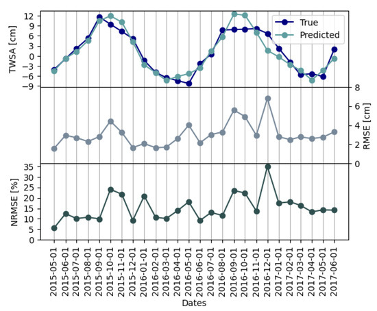 The changes, or anomalies in EWT, were calculated with respect to the 2004–2009 mean baseline and they represented the total terrestrial water storage anomalies (TWSA) from soil, snow, surface water, groundwater, and aquifers. The GRACE mission started in April 2002 and ended in June 2017, but in March 2018, the new GRACE-Follow-on (GRACE-FO) mission started. Given the missing values from October 2017 to March 2018, we obtained monthly data from April 2002 to June 2017. Given the relevance of the temporal relationship of the phenomenon, the period from April 2002 to April 2015 was considered as the training set, roughly 85% of the available observations, and the test set as the period from May 2015 to June 2017, nearly 15% of the available observations.