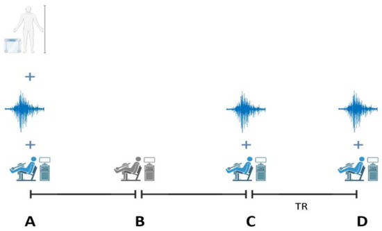 Schematic representation of the assessment and fatigue induction protocol with anthropometric evaluation and maximum voluntary isometric contractions (MVICs) (A) fatigue induction protocol (B), MVICs (C) MVICs and (D) MVICs + recovery treatment (TR).