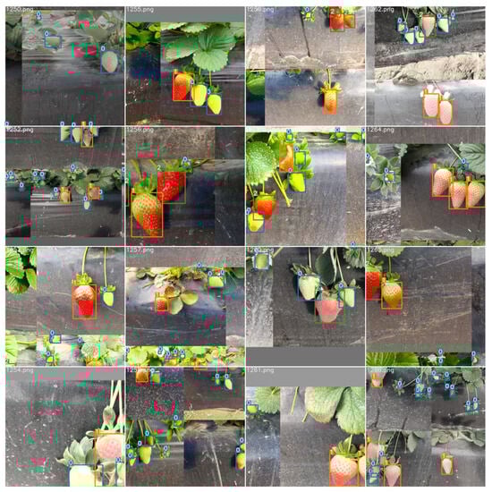 Data augmentation can increase data variance for training, which has the potential to enhance model performance in terms of mitigating the model overfitting and increasing the generalizability of the developed model. In this work, the image augmentation methods included brightness change, image rotation, translation, scale, shear and perspective, horizontal and vertical mirroring, mosaic, mix-up, copy–paste and paste in. The parameters used for data augmentation are listed in Table 2. The variations in the complex lighting conditions contributed to disparities in the strawberry fruit images, leading to a potential interference with the detection outcomes. To counter this challenge, adjustments were made to the values of the three HSV channels (hue, saturation, and value) to represent distinct brightness levels. Simultaneously, techniques involving image transformation and mirroring (both horizontally and vertically) were implemented. For mosaic data augmentation, four images were randomly chosen and integrated into a single image following random scaling and cropping. This approach enhanced the richness of the training data within each batch size without escalating the batch size itself, thereby mitigating the GPU’s video memory consumption. The mix-up method employed linear interpolation to construct fresh training samples and corresponding labels, effectively expanding the dataset. Additionally, the training dataset’s scope was broadened through the copy–paste method, which generated supplementary training data by randomly duplicating a subset of instances from one image and embedding them onto other images. Examples of augmented images can be found in Figure 1.