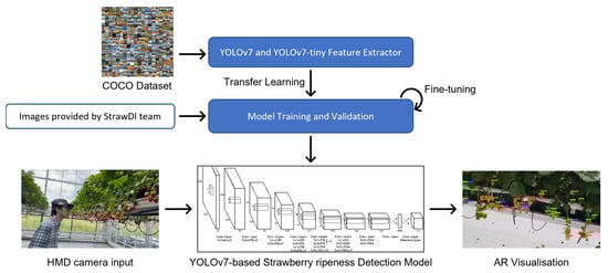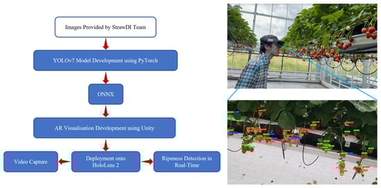 Figure 3 presents the proposed integrated framework integrating deep learning and augmented reality technology. To begin with, the YOLOv7 model was developed using an online database provided by the StrawDI team. The pre-trained model was then directly exported in the Open Neural Network Exchange (ONNX) format, which enables developers to share DL models between different platforms. The pre-trained model was subsequently executed in Unity. The AR application was developed within Unity on 30 March 2020, utilising the most recent Windows 10 SDK along with certain components and features from Mixed Reality Toolkit (MRTK) 2. During the project’s compilation in Unity, the designated platform was UWP, with the intended device being HoloLens, employing ARM64 architecture. The application was tested in the strawberry greenhouse of Ashtown Food Research Centre, Teagasc, Ireland. The first proposed implementation method involved using both Hololens and HoloLens 2 to capture the footage to simulate the AR visualisation. The second approach aimed to realise the ripeness detection in real time. The HMDs captured RGB images from the user’s perspective and forwarded them to a pre-trained model for the acquisition of detection outcomes. The predicted outputs included bounding boxes and the predicted classes were overlayed onto the real world, allowing DL to be integrable in the augmented reality application.