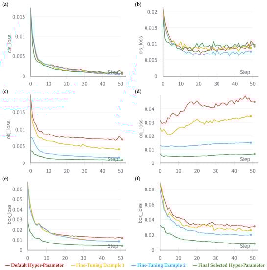 Example of the fine-tuning practice and iterations comparing the loss curves of the default hyper-parameter, two examples after fine-tuning, and the final selected hyper-parameter. For the training set, the classification loss, objectness loss, and box loss are presented in (a,c,e), respectively. For the validation set, the classification loss, objectness loss, and box loss are presented in (b,d,f), respectively.