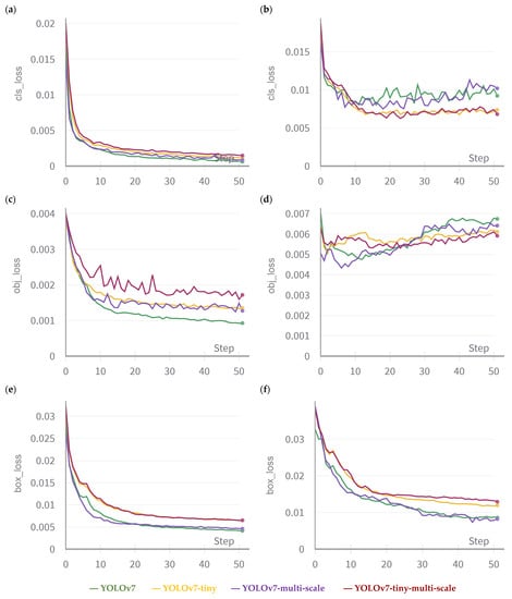 For the training set, the classification loss, objectness loss, and box loss are presented in (a,c,e), respectively. For the validation set, the classification loss, objectness loss, and box loss are presented in (b,d,f), respectively. Multi-scale refers to the model trained on images of various scales. Tiny means a model using fewer layers and smaller filters to reduce computation time.