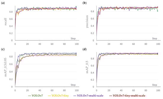 The evolution of recall (a), precision (b), mAP at 0.5:0.95 (c), and mAP at 0.5 (d) during the training process. Note: multi-scale refers to the model trained on images of various scales. Tiny means a model using fewer layers and smaller filters to reduce computation time.