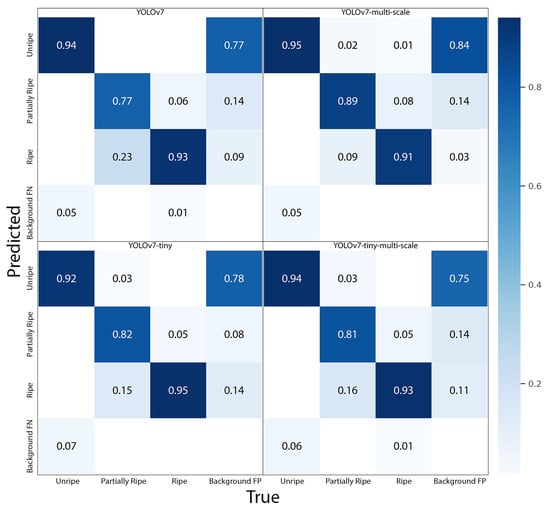 Figure 7 illustrates the normalised confusion matrices of the four established models. A quick examination of the matrices reveals that the class of “partially ripe” strawberries presented the greatest challenge for detection, as a relatively high number were incorrectly classified as “ripe” strawberries. Additionally, it is apparent that the “unripe” class had the highest rate of background false positives, indicating a greater similarity between the background and unripe strawberries. Among the models, the YOLOv7-multi-scale excelled in identifying “unripe” and “partially ripe” strawberries, achieving accuracies of 0.95 and 0.89, respectively. However, this model also demonstrated the highest background false positive rate of 0.84, indicating a greater likelihood of incorrectly identifying part of the background as an unripe strawberry. Conversely, the YOLOv7-tiny-multi-scale was the most accurate at detecting “ripe” strawberries, with an accuracy of 0.95.