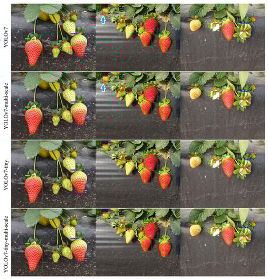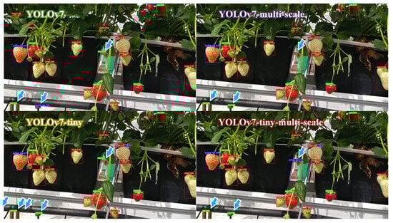 Figure 8 shows the ripeness detection results from three randomly selected test images. The various developmental stages of strawberry fruits are represented by bounding boxes of distinct colours, with red indicating “unripe”, blue indicating “partially ripe”, and green indicating “ripe” strawberries. Overall, all models demonstrated a good performance, with the majority of strawberries being correctly identified. However, it is worth noting that the YOLOv7 and YOLOv7-multi-scale models mistakenly detected a leaf as an unripe strawberry (as is indicated by blue arrows in the figure), yet this was not observed in the tiny models.