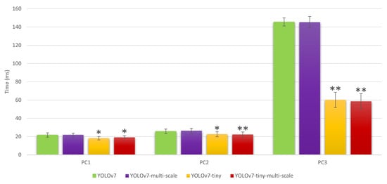 Detection speed(s) of individual models running on various computers (i.e., PC1, PC2, and PC3). * significant different from YOLOv7 model at p < 0.01, ** significant different from YOLOv7 model at p < 0.001.
