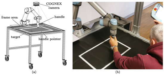 As mentioned, the main objective of the rehabilitation framework is to train the ability of stroke patients to follow a given trajectory chosen by the physiotherapist to accomplish a task. Thus, UR5e, a collaborative robot by Universal Robots, has been equipped with a handle that is specifically designed for individuals who, due to mild to moderate spasticity, struggle to exert grasping force or have difficulty opening their hands. The patients are asked to move the handle, which is provided with a pointer, toward an object, which serves as a target. The position is dynamically recorded by a COGNEX camera and transmitted to the UR5e controller via TCP communication. A specific program was developed to make the robot accomplish two basic tasks: helping the patient in running the linear trajectory toward the target, and hindering possible deviations from that path by means of an elastic pull-back force. The implementation was conducted using Polyscope 5, by Universal Robots software, Odense, Denmark. For patient safety, robot velocity and accelerations were limited; moreover, the framework allowed patients to sit outside of the robot’s reach to prevent accidental head contact.