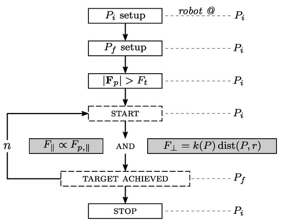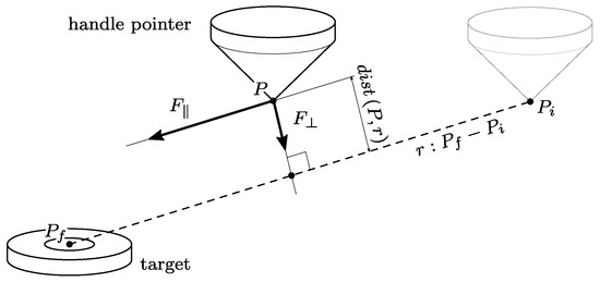 As mentioned above, the three components of force to be exerted by the cobot are computed to pursue two different aims: to help the motion along line r, and to contrast any deviation from such a trajectory. Thus, two components of the human–robot interaction force are considered, i.e., parallel and perpendicular to r (see Figure 3).