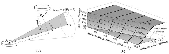 The force component that is orthogonal to the ideal direction of motion is determined by a variable stiffness law designed to provide smooth robot reactions, especially across the r line. In addition, according to the suggestions of practitioners, it is useful for patients to have higher compliance when the handle pointer is far from the target, while it should become stiffer when approaching . To achieve this purpose, a variable stiffness k is implemented, as graphically presented in Figure 4. In a few words, a conic transition space is defined around line r (Figure 4a). Within such a space, the stiffness follows a cubic trend, from 0 (when , i.e., when the patient follows the trajectory) to a maximum value on the surface of the cone (as shown in Figure 4b). The apex of the cone coincides with , while its aperture is given by the maximum radius reached at . For simplicity, is set proportionally to the distance . Here, the constant that rules the proportionality is . Thus, the cone radius is a linear function of the distance d between the handle pointer P and the target projected on the line r, i.e., .