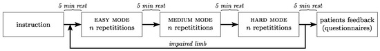 - Once the subject completes n repetitions, the exercise is over, and the patient’s hand is moved back to ; the caregiver then decides if a further set of repetitions has to be conducted with identical or new force parameters.