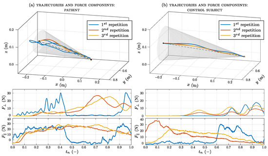 Example of the experimental results in terms of trajectories and force components for a patient (a) and a control group subject (b).