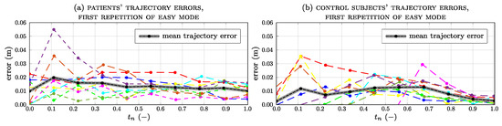 The trajectory’s error is defined as the difference between the real trajectory and the ideal one. The quantitative results from the trajectory analysis are listed in Table 2, which shows the mean error calculated for the impaired and the control group in each working mode (i.e., easy, medium, and hard). For comparable results between the two groups, errors are calculated based on trajectories performed by the impaired arm in the patient group and the non-dominant arm in the control group. The trajectory executed by the patient group deviates more from the planned one than that performed by the control group; the largest mean error for both groups lies in the easy mode, with an overall value of m (for the patient case) and m (for the control case). Even if patients have coordination problems, they still manage to perform the exercise with low error values. Figure 8 shows the trend of the trajectory error for each subject and the average error (in black) for all subjects during the first repetition of the easy modality (Figure 8a for patients, Figure 8b for the control group). In patients, the average error is the highest at the beginning of the exercise (), reaching a value of 0.02 m. In the control group, the error slightly increases from and phases and decreases from in the completed exercise. However, the error is still very low and subjects are able to follow the planned trajectory smoothly.