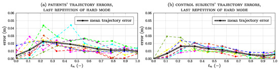 Figure 9 shows the trajectory error trend and the average for all subjects during the last repetition in the hard-working mode. As each subject performed the exercise several times, the average curves for both groups are similar; however, the errors for the patients are slightly higher than for the healthy subjects, peaking at around of the exercise’s completion.