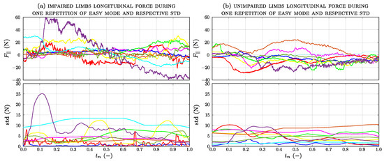 Longitudinal force during one repetition of the easy mode of all patients: (a) impaired and (b) unimpaired limbs.