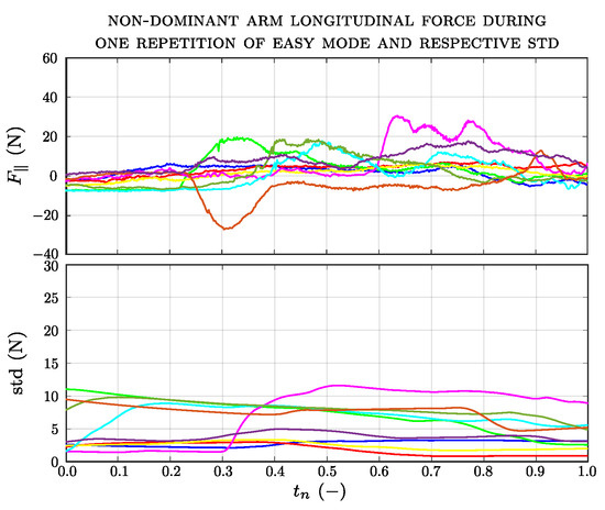 Figure 10a shows the longitudinal force applied by each impaired limb and the corresponding standard deviation calculated over a sliding window of 500 samples. Only the longitudinal force applied by patient differs significantly from the general trend of all the others, ranging between −20 N and 30 N. Figure 10b shows the longitudinal force and the sliding standard deviation of each unimpaired limb applied by the patient group. In most cases, the values of the forces are similar to those applied by the impaired limb, while their trends are different. In the case of the impaired arm, the trend of the standard deviation presents higher peaks. Figure 11 shows the longitudinal force applied by the non-dominant arm and the corresponding standard deviation for the control group.