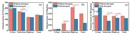 Figure 3b displays the CO emission factors across different road types. The graph reveals an inverse emission pattern of CO and CO2. In the absence of detergent, the CO emission factor is significantly lower on urban roads compared to suburban roads and highways. Specifically, on urban roads, the CO emission factor is 0.0024 g/km, whereas on suburban roads, it increases by over 5 times to 0.01228 g/km, and on highways, it surges by more than 17 times to 0.04136 g/km. This indicates that road types exert a notable influence on CO emission factors, with the hierarchy being highways > suburban roads > urban roads under non-detergent conditions. Upon the application of detergent, the CO emission factor becomes nearly negligible on suburban roads. On urban roads, it remains equivalent to the non-detergent condition at 0.00264 g/km. However, on highways, the emission factor increases, growing by 7.79 times compared to urban roads, reaching 0.02057 g/km. However, compared to the non-detergent condition, the CO emission factor decreases by 50.27%. Overall, improving gasoline detergency demonstrates effective CO emissions reduction on suburban and highway roads. However, its impact on urban roads is not significant, and there is even a slight increase in CO emissions.