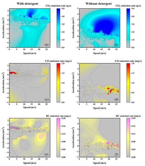 Correlation between vehicle speed, acceleration, and emission rates: (a) CO2 with detergent; (b) CO2 without detergent; (c) CO with detergent; (d) CO without detergent; (e) HC with detergent; (f) HC without detergent.