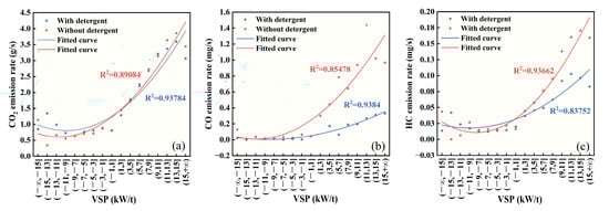 Relationship between emission rates and VSP under different fuel detergency conditions: (a) VSP-CO2, (b) VSP-CO, and (c) VSP-HC.
