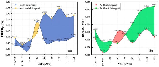 As shown in Figure 6, the analysis focuses on the distribution of emission indications with respect to VSP to comprehensively assess the collective influence of speed, acceleration, and road gradient. In Figure 6a, the CO emission indicator is analyzed with respect to VSP Bin. The yellow dots represent the CO/CO2 ratio without the addition of detergent, while the blue dots represent the ratio after the addition. The yellow region indicates the reduction in CO emissions per 1 kg of CO2 emitted due to the addition of detergent, while the blue region represents the additional CO emissions emitted. From Figure 6a, it is evident that the majority of VSP intervals show a reduced CO/CO2 ratio after the application of detergent, indicating a reduction in the amount of CO produced per unit of fuel consumption. However, a slight increase in the CO emission indicator is observed when VSP ranges from −2 to 4. The analysis of area proportions reveals that the additional CO emissions per 1 kg of CO2 emitted after detergent addition are significantly lower than the achieved reduction. Thus, enhancing gasoline detergency proves to be an effective approach for achieving synergistic CO and CO2 emission reductions throughout the complete vehicle driving cycle.