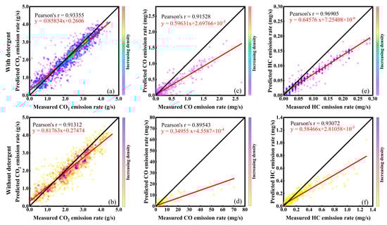 Pearson’s r was utilized to reflect the linear regression relationship between the measured values and the DPVEM-DGD model predicted values. MSE was used to evaluate the accuracy of the model by computing the average squared difference between the predicted values and the measured values. Under the non-addition of detergent condition, Pearson’s r values of CO2, CO, and HC were 0.91312, 0.89543, and 0.93072, respectively. The MSE values of CO2, CO, and HC were 0.20, 1.14 × 10−5, and 6.20 × 10−9, respectively. After the introduction of detergent, Pearson’s r values of CO2, CO, and HC were 0.93355, 0.91528, and 0.96905, respectively. The MSE values of CO2, CO, and HC were 0.14, 2.52 × 10−8, and 4.45 × 10−10, respectively. Pearson’s r was close to 1 for both detergency conditions, indicating a strong linear relationship between the predicted and measured values. Additionally, the small MSE values suggest that the model’s predictions have minimal error compared to the actual measurements. These findings demonstrate the DPVEM-DGD model’s excellent performance in predicting exhaust emissions, which could provide accurate predictions for both conditions. After the addition of detergent, the DPVEM-DGD model exhibited improved performance in predicting CO2, CO, and HC, as evident from the higher Pearson’s r values and lower MSE values compared to the pre-addition scenario []. Moreover, the fitted regression lines were even closer to the perfect line (y = x), as illustrated in Figure 8. The results indicated that improving the detergency of the gasoline could effectively enhance the predictive performance of the model for instantaneous exhaust emission rates. This improvement was likely attributed to the enhanced gasoline detergency, which led to improved engine combustion and reduced peak emissions during sharp increases, resulting in smoother emission rates. Consequently, the prediction difficulty was reduced, resulting in better predictive performance.