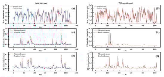 To validate the predictive accuracy of the DPVEM-DGD model, a comparison was conducted between the predicted values and measured values, as shown in Figure 9. From the graph, it was evident that the model could effectively predict the instantaneous emission rates of different exhaust gases under both detergency conditions. The results of all six times predictions indicated that the model was capable of forecasting the occurrence of emission peaks. However, there existed a certain discrepancy between the predicted values of peak magnitudes and the measured values. The potential cause for the limited accuracy in peak value predictions could be attributed to the relatively limited size of the training dataset, resulting in inadequate learning of the peak emission characteristics by the model []. Another potential factor could contribute to the influence of various external factors. Achieving precise peak predictions could require incorporating a broader range of input features for the prediction process []. Upon comparative analysis of Figure 9c–f, it was evident that the introduction of the detergent had resulted in a mitigated increase of peak values in the instantaneous emission rates of CO and HC. This amelioration positively influenced the accuracy of predicting their peak values. As shown in Figure 9c,e, the instantaneous emission rates of HC and CO exhibited similar changing patterns with a simultaneous increase after the addition of detergent, whereas no such correlation was observed before the addition of detergent. One possible conjecture was that the addition of detergent clears partial carbon deposits in the engine’s intake system, reducing the intake pressure of the engine and thereby mitigating the influence of unstable external factors. This may lead to a more apparent emission pattern, increasing the likelihood of achieving accurate predictions.