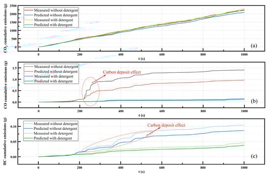 As shown in Figure 9, the emissions of CO and HC from vehicles were low in most cases, but there were certain regions where the emissions showed a significant increase. Figure 10 presents the cumulative emissions of the exhaust measured values and predicted values taken from the test dataset for a continuous period of 1000 s. As shown in Figure 10a, the cumulative emissions predictions of CO2 under both conditions were relatively close to the measured values, but the difference between the predicted and measured cumulative emissions was smaller in the additive condition.