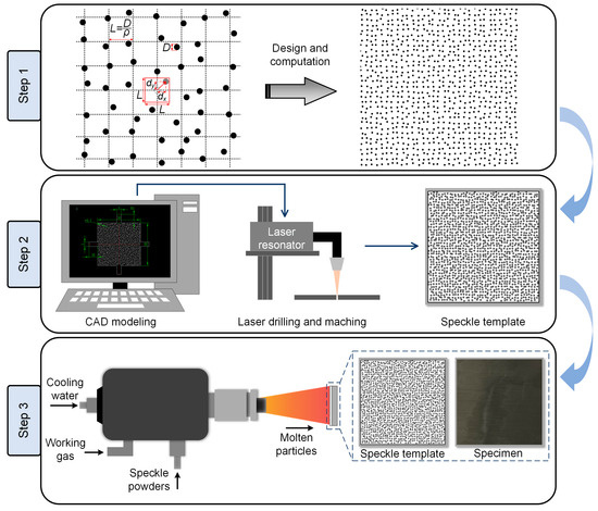 Many efforts have been devoted to fabricate stable and high-contrast high-temperature speckle pattern for high-temperature deformation measurement. These approaches include but not limited to abrading the sample surface, high-temperature paint spraying, splashing the mixed speckle pattern and plasma spraying. For instance, Grant et al. [20] prepared the speckle patterns by abrading the sample surface with a 1200 grit silicon carbide paper to assure a homogeneous distribution of scratches without any preferential directions. In addition, customizable engraving speckles with femtosecond laser were also proposed for the DIC measurement at elevated temperatures [21]. Although both these two methods do not require additional speckle materials, the specimen surface could be damaged by the femtosecond laser or the silicon carbide paper, leading to the concentration of residual stress [11]. By contrast, high-temperature paint spraying or brushing are mostly adopted for the high-temperature speckle fabrication due to their non-destructive nature and broad applicability [14], which mainly involves depositing a mixture of high-temperature-resistant materials and inorganic high-temperature adhesive onto the surface of the sample. For these approaches, the ceramic oxides (e.g., cobalt oxide (CoO2) and zirconium dioxide (ZrO2) [22,23,24]) are commonly used as the speckle pattern material because of its stability and heat-resisting property at elevated temperatures [25]. Nevertheless, when exposed to ultra-high-temperature environment or undergo thermo-mechanical coupling loading, the speckles made by high-temperature paint spraying may still experience spalling or peeling-off. To address this problem, an approach based on air plasma spraying was proposed for fabricating high-temperature speckle pattern [26], which was demonstrated at the temperature up to 2600 °C. Note that plasma spraying is capable of melting materials and depositing them onto the surface of the sample, resulting in higher bonding strength. However, in this method, the specimen surface was merely coated with a uniformly distributed wire mesh and then sprayed with speckle materials. As a result, the fabricated speckle patterns exhibited a sparse and periodical spatial distribution, which may degrade the measuring accuracy or even lead to a failure during DIC analysis.