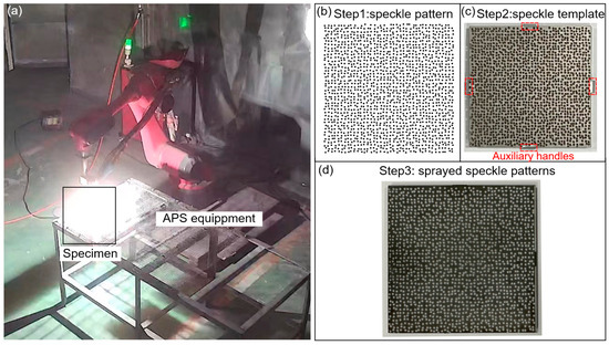 To investigate suitable speckle size and APS spraying outcome, several square samples of Nickel-base alloy GH4169 measuring 50 × 50 × 2 mm were employed, as shown in Figure 3a. Taking the speckle pattern simulated with the speckle diameter D of 0.5 mm as an example to show the implementation process for spraying APS-based speckle patterns on specimen, as depicted in Figure 3b. Subsequently, a stainless-steel speckle template with a thickness of 0.5 mm was custom-made, replicating the simulated pattern distribution. The template was then affixed to the sample surface using four auxiliary handles, as shown in Figure 3c. Since the blasted sample surface shows black, white 8YSZ powders (8 wt% Y2O3 Stabilized ZrO) are used to prepare customized speckle patterns. The speckle coating, with a thickness of 70 μm, is then deposited on the GH4169 sample surface using a commercial plasma spray system (BJXT-F4, Beijing Xinte, Beijing, China). The specific APS parameters utilized in this study are provided in Table 1. As demonstrated in Figure 3d, the obtained speckle pattern closely resembled the input speckle pattern.