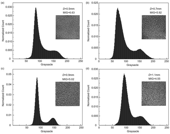 The grayscale distribution and MIG value of speckle pattern with different speckle diameter D: (a) 0.5 mm, (b) 0.7 mm, (c) 0.9 mm and (d) 1.1 mm.