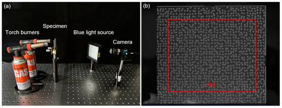 As depicted in Figure 6a, the GH4169 sample was heated by two torch burners, while the images of sample surface were captured using a CCD camera (ME2L-161-61U3M-L, Beijing Daheng Image Vision Co., Ltd., (Beijing, China) sensors:1/2.9″, 1440 × 1080 pixels) equipped with an imaging lens (Xenoplan 1.4/23-0902, Schneider Optics, Inc., (Hauppauge, NY, USA) Bad Kreuznach, Germany). Active imaging devices, including optical bandpass filter (center wavelength: 480 nm; full-width at half-maximum (FWHM) value: 10 nm) and monochromatic light source (480 ± 10 nm, 25 W) were implemented to suppress the thermal radiation from heated object. Note that the speckle diameter D of 0.5 mm corresponded to approximately 10 pixels for this experiment setup. The capturing system placed 0.5 m way from the specimen, with its optical axis approximately perpendicular to the nominal sample surface. By adjusting the imaging lens, a clear reference image with good contrast was recorded as shown in Figure 6b. Then, the sample was heated from room temperature to 700 °C, and the infrared thermometer real-time monitored the variations of sample temperature, which is documented as Stage 1. Seven images of the deformed specimen were consecutively recorded at temperatures from 100 to 700 °C with a temperature increment of 100 °C at each step. Subsequently, the torch burners were positioned in front of the speckled surface, enabling a high-velocity airflow with elevated temperature to thoroughly flush the surface, constituting Stage 2. Multiple images of the specimen were recorded at various intervals during the flushing process.