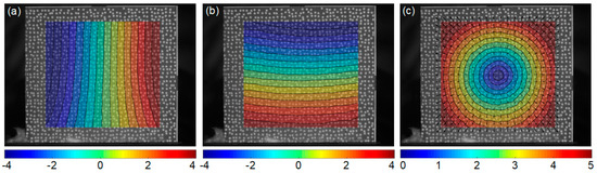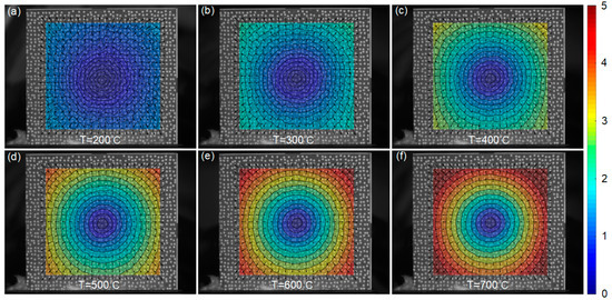 After that, radial displacements of the sample at different temperatures are shown in Figure 8, visualized using the same colorbar range. Apparently, approximately concentric circles can be observed, with the magnitude of displacements increasing as the temperature up. The corresponding x-directional and y-directional thermal strains of the sample at elevated temperatures are provided in Table 3. It is apparent from Table 3 that the measured thermal strains increase with the applied temperatures, and are almost identical in horizontal and vertical directions at each temperature step. This observation is consistent with the isotropic characteristics of GH4169, i.e., the coefficients of thermal expansion (CTEs) along the x and y directions are equivalent. The experimental measurements of the CTEs exhibit a discrepancy of less than 4% compared to the theoretical values, which can be attributed to the potential variations in the composition of material.