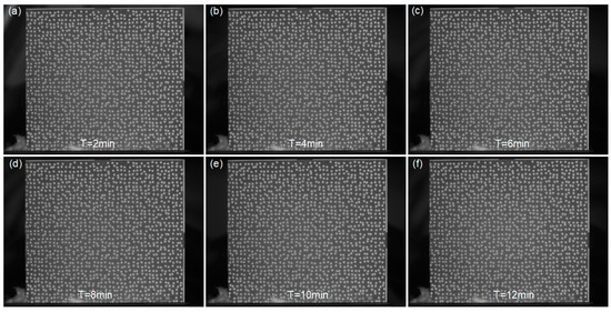 Moreover, Figure 9 shows the surface images of the GH4169 specimen recorded during the Stage 2. It can be observed that as the flushing time increases, the speckle patterns remain tightly adhered to the sample’s surface without significant changes, and the captured images exhibit relatively stable gray intensity. To gain further insights into the adhesion effectiveness of the APS-based speckle patterns, the grayscale distribution of these images is extracted as shown in Figure 10a, demonstrating consistent grayscale distribution curves at different flushing intervals. Furthermore, the characteristic variations of high-temperature speckles during the heating process serve as another crucial factor for assessing speckle quality. As depicted in Figure 10b, the speckle patterns maintain stability with a constant count of 1611 throughout the heating and flushing process, exhibiting no cracks or spalling. With the temperature increase, the MIG values of these images fluctuate around 6.459, with a maximum variation of approximately 0.130. All these results affirm that the proposed speckle patterns closely adhere to the sample’s surface throughout the entire process, confirming its applicability for accurate high-temperature DIC measurements.