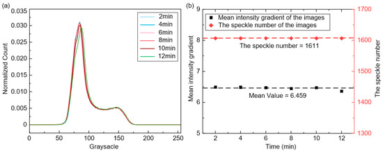 Characteristic changes of speckle patterns within ROI of the recorded images at different intervals: (a) grayscale distributions, (b) the speckle number and MIG values.