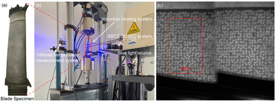 (a) The sprayed blade specimen, (b) experimental arrangements for measuring the thermal deformation and (c) the reference image of the specimen captured at room temperature.