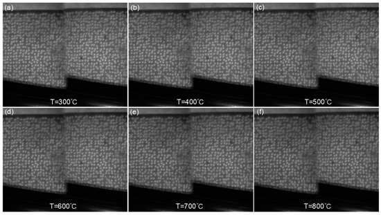 Surface images of the curved blade sample captured by the experimental system at temperatures of (a) 300 °C, (b) 400 °C, (c) 500 °C, (d) 600 °C, (e) 700 °C and (f) 800 °C.