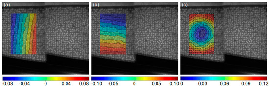 Full-field thermal deformation of the blade sample at 182 s, at a temperature of approximately 800 °C: (a) u−displacement, (b) v−displacement and (c) resultant displacement (units: mm).
