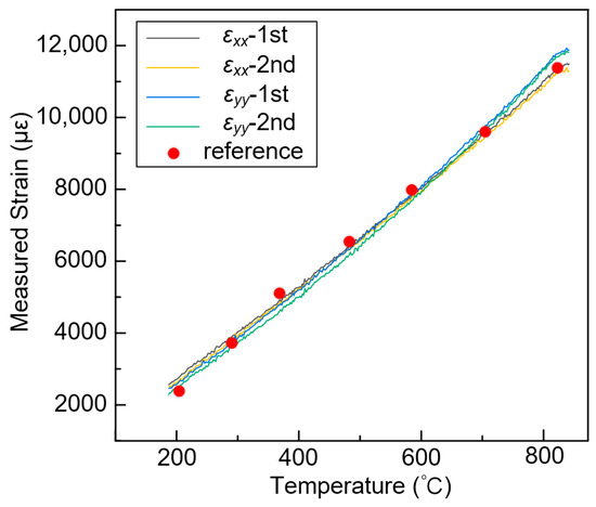 After all the reference and deformation images were recorded, a rectangular area near the center of heating was selected as the ROI (67 × 106 points corresponding to the area of 12.2 × 18.8 mm), as shown in Figure 11c. A 57 × 57 pixels subset size and a 11 pixels grid step were set as the calculation parameter for each point of interest. Then, the displacement and strain maps within the ROIs were obtained using the pointwise least squares fitting algorithm [38,39]. Figure 13 displays the measured full-field displacements of the blade sample at 182 s and a temperature of approximately 800 °C. The u − and v − displacement without in-plane rigid body motion are shown in Figure 13a and Figure 13b, respectively. The uniformly distributed contour lines nearly parallel with the y and x axes, demonstrating that homogeneous thermal expansion occurred in both horizontal and vertical directions. Furthermore, the radial displacements exhibit an approximately concentric circular pattern, as shown in Figure 13c. The average strains of the sample strain maps are extracted as the measured strains. However, due to minor curvature on the blade surface, there is a slight difference in the mean strains between the horizontal and vertical directions, measuring at 11,283 με and 11,636 με, respectively. Moreover, all of these recorded images are analyzed and the measured strains are plotted as a function of the temperature, as shown in Figure 14. It should be noted that the strain measurement results in the range of 25–200 °C are omitted since the infrared radiation system’s measuring range exceeds 200 °C. The agreement between the measurement results and reference values [40] confirms the feasibility and validity of the proposed speckle patterns for high-temperature deformation measurements of curved specimens.