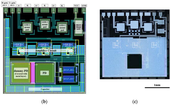 The design of the CMOS chip is illustrated in Figure 2. The CMOS chip comprises monolithically fabricated photodiodes, amplifier circuits, and mounting pads for LEDs and a capacitor chip. The outline size of the CMOS chip is 2900 μm × 2900 μm, and the chip is 400 μm thick. The active area of the PDs is 600 μm × 600 μm. One PD was covered with a top metal layer, and the differential output from the other was used as the PD output. The output of the PD was amplified using amplifier circuits with two different gains, H-gain and L-gain, and the output pin was selected based on the light-receiving intensity. The CMOS chip contains three 355 μm × 355 μm LED pads. By mounting the LEDs with different emission wavelengths, optical measurements for up to three different wavelengths could be performed by switching the LEDs to be driven. The wiring pads for all external connections, such as the PD outputs, supply voltage, ground, and LEDs, were arrayed on the top edge of the CMOS chip. As LED chips have anode and cathode terminals (shown as A+ and K− in Figure 2b) on the top and bottom surfaces, respectively, the anode side is connected via an aluminum wiring pattern on the CMOS from the LED mount pad, while the cathode side is connected by wire bonding from the LED top electrode to the cathode pad.