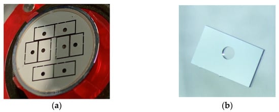 In the structure of the developed optical sensor, it is crucial to consider that the LED emission is not directly received by the PD because of the close distance between the LEDs and the PD, and their location on the same surface. Therefore, we designed a 250 μm thick shading block with a pore diameter of 600 μm for light transmission, which selectively receives light through the blood. The shading block was fabricated by processing Si wafers via a deep reactive ion etching (DRIE) process called the Bosch process [,,]. The DRIE process selectively etched Si vertically while alternately supplying C4F8 (passivation gas) and SF6 (etching gas). The metal mask for DRIE was formed via lithography on a Si wafer with sputtered aluminum, followed by dry-etching patterning of aluminum. The process conditions were optimized according to Ref. []. All fabrication processes were implemented using a minimal fab, which is a semiconductor fabrication system that excels in prototyping and high-mix, low-volume production []. Figure 3 displays a photograph of the shaded blocks. Eight shading blocks were fabricated on a half-inch Si wafer. Shading blocks composed of Si with the DRIE process enabled us to easily achieve a high processing accuracy of micrometer precision and the same smoothness as that of a CMOS chip, which enabled stacking without gaps on the CMOS chip.